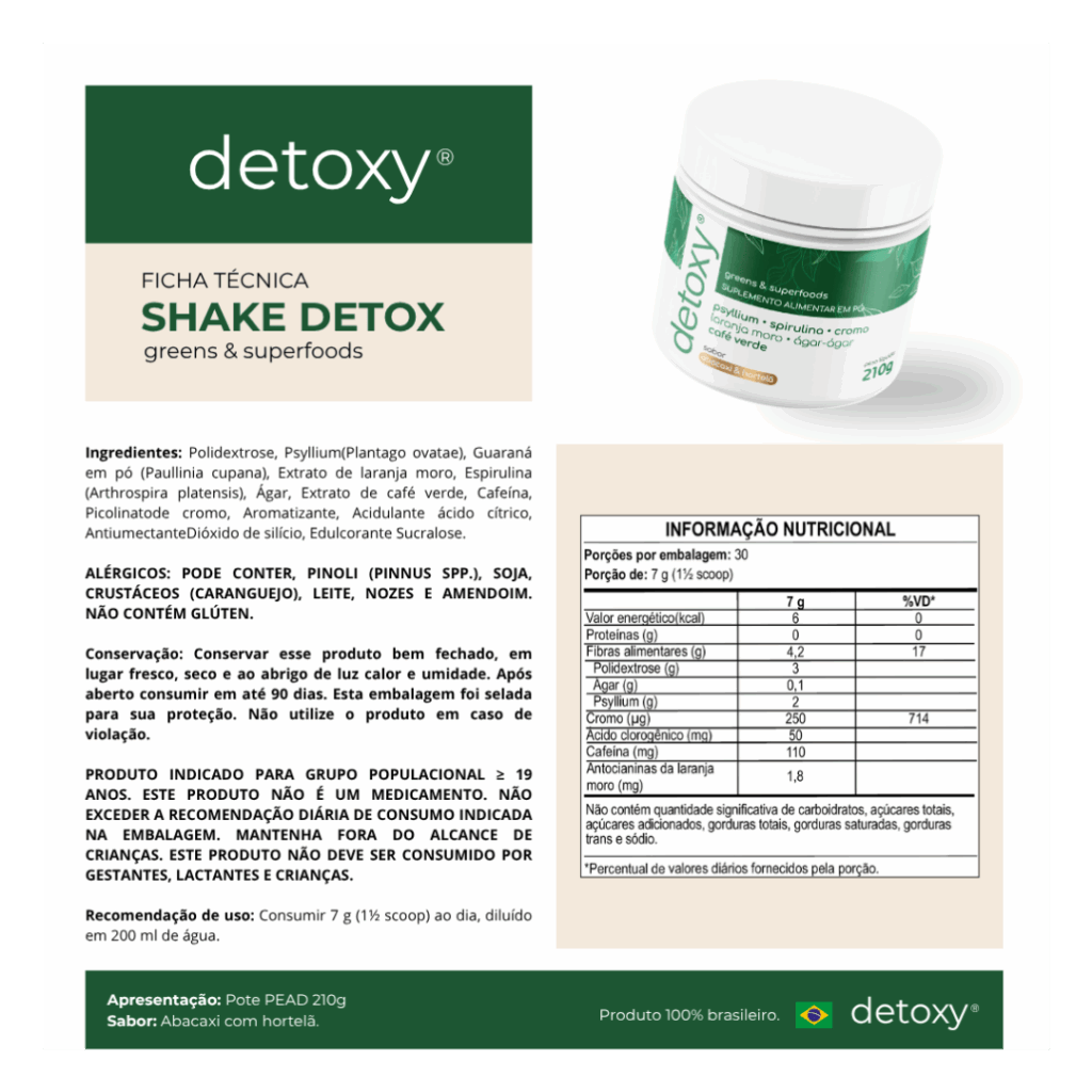Indicamos utilizar 7g (1 scoop e meio) com um copo de 200mL de água. Ingerir preferencialmente pela manhã, antes do café da manhã, para aproveitar ao máximo o poder do Detoxy.
